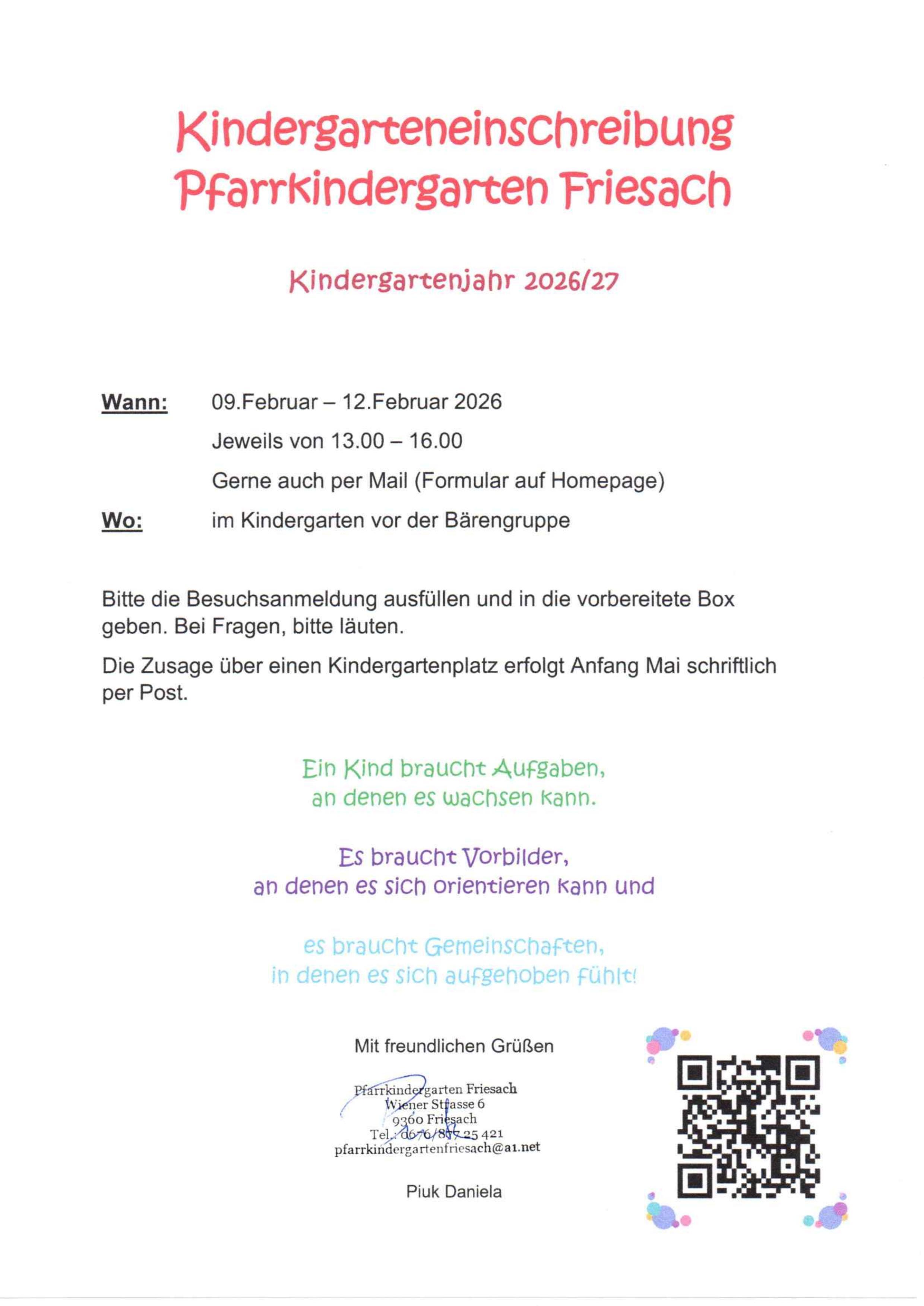 Pfarrkindergarten Friesachvor 1 MonatKindergarteneinschreibung 2026/27Kindergartenanmeldung2026-271 Seite